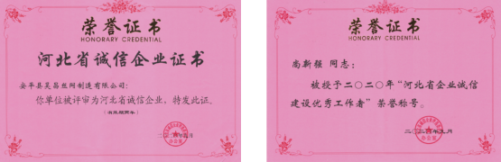 近期,由河北省誠信企業評選委員會辦公室聯合河北省企業家協會組織召開的“河北省誠信企建設經驗交流會”在石家莊市隆重舉行。會上,安平縣昊昌絲網制造有限公司被大會評選為“2020年河北省誠信企業”,公司總經理尚新強榮獲“河北省誠信建設優秀工作者”榮譽稱號,這標志著公司在積極創建誠信守法企業,積極履行企業社會責任方面得到國家相關部門的肯定與認可。