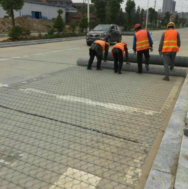 鋼絲路面加筋網是14#低碳鋼絲由六角網孔機器編織的加筋網,加筋棒直徑3.4mm/4.4mm,網格大小為80*100mm,加筋棒間距為164.5mm,鋪在瀝青路面中下層后混凝土基底層頂面加筋