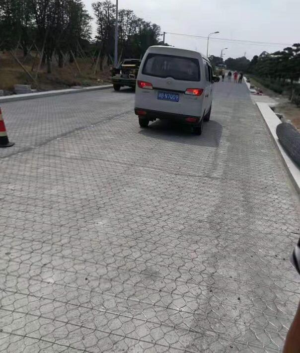 路面加筋網為機織雙絞六角形金屬網卷,網孔80mm?00mm每間隔1645mm加一根筋絲3.4mm加筋棒加固,網絲直徑一般在2.0mm-2.4mm之間,網絲鍍層重量在30g/㎡-230g/㎡不等,網卷寬度1m-4m之間.