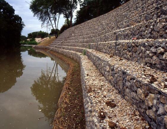 (3)鍍鋅鋼絲包塑:優質低碳鋼絲,在鋼絲的表面包一層PVC或PE保護層,再編織成各種規格的石籠網.這層保護層將會大大增加在高污染環境中的保護,并且通過不同顏色的選擇,使其能和周圍環境融合.